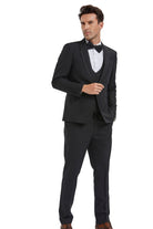 The vest matches the jacket, with three buttons and a double-breasted look that's both trendy and timeless. The pants are snug but comfortable, designed in the same Black pattern with a smooth texture.
