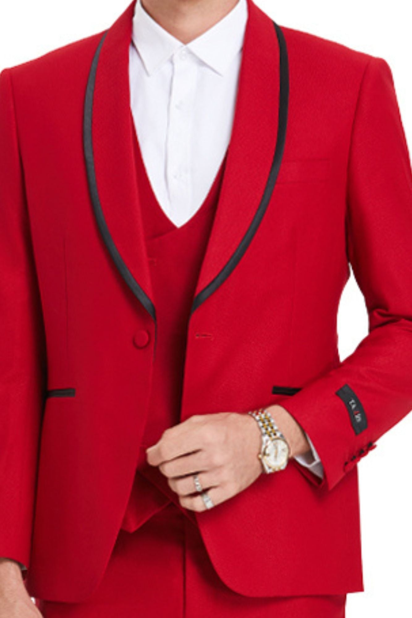 The vest matches the jacket, with three buttons and a double-breasted look that's both trendy and timeless. The pants are snug but comfortable, designed in the same Red, pattern with a smooth texture.