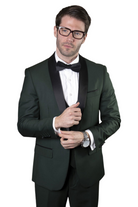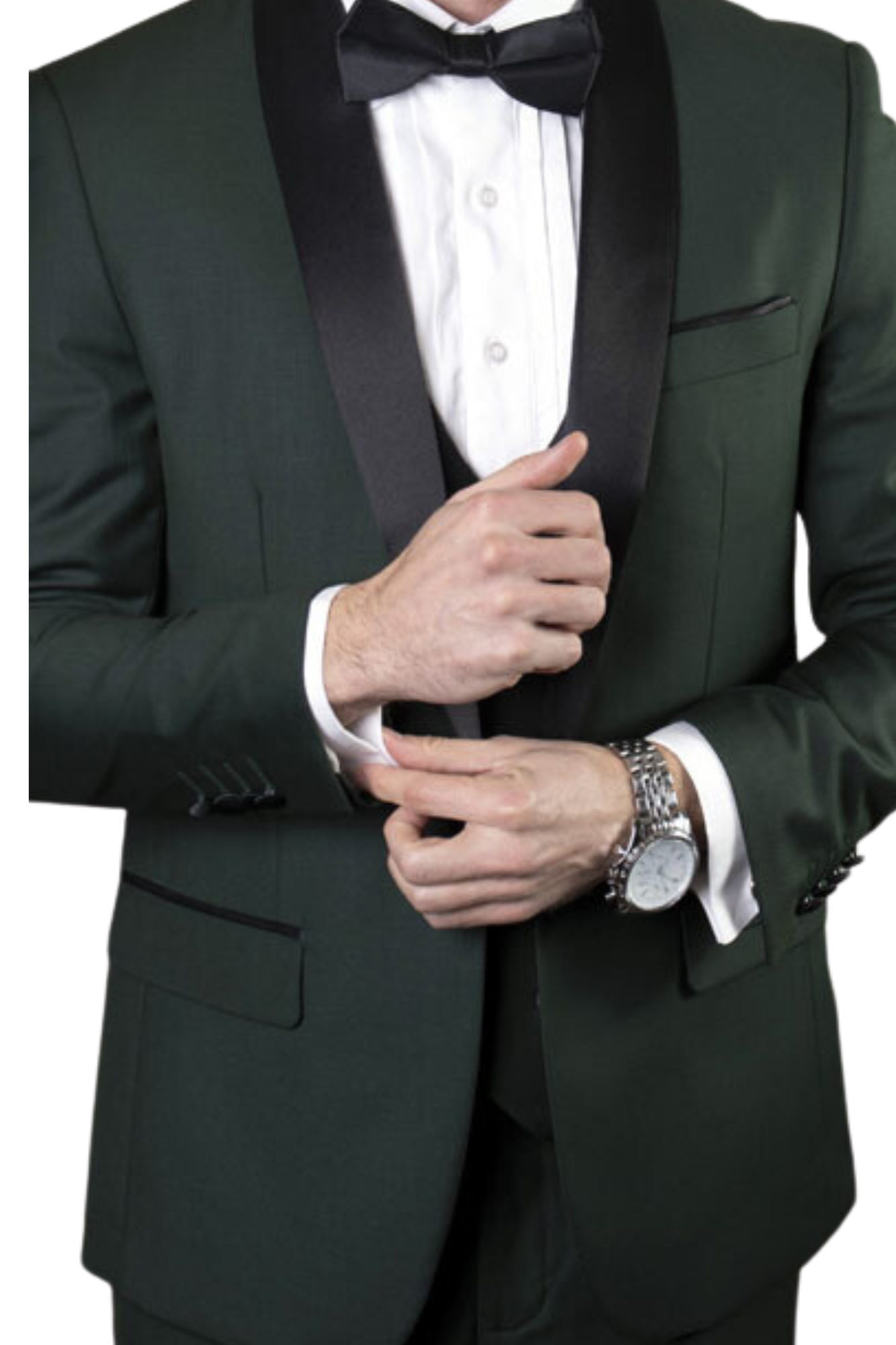 Unveil your refined sense of style with the Trendito Collection Hunter 3PC Shawl Lapel Tuxedo. In a captivating shade of hunter green and designed with a Modern Fit, this 100% wool tuxedo will have you setting trends at any formal occasion.