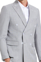 Jacket: Features a peak lapel and double-breasted front with two-button closure, designed in a striking Light Grey Pinstripe. Side flap pockets add a practical touch to its refined appearance.