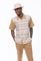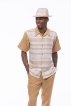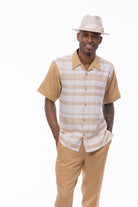 Refine your style with this Montique walking suit from the Tucana Collection, a perfect blend of bold patterns and classic elegance. Featuring a short-sleeve button-down shirt with a geometric checkered pattern and solid-color pants, this suit is designed for relaxed yet sophisticated occasions. Its adjustable waistband ensures a tailored fit, combining both style and comfort in one striking ensemble. Pair it with the matching hat from the Tucana Collection, sold separately, for a fully coordinated look.