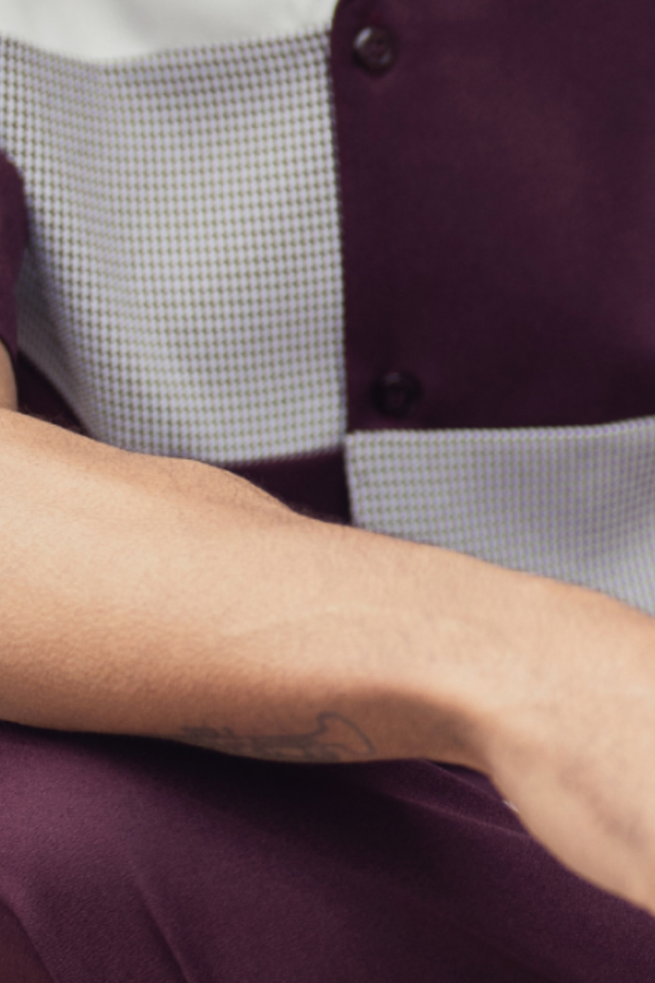 Introducing the pinnacle of sophisticated urban style with our Tykes Collection's Wine Houndstooth Color Block Suit. This 2 piece ensemble artfully blends the classic allure of houndstooth with a bold, modern color block design in sleek Wine. It's a statement piece that seamlessly bridges the gap between timeless tradition and contemporary fashion. Whether it's for a high-profile meeting or a chic social event, this suit promises to elevate your style quotient.
