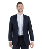 Elevate your evening wear with the Vanguard Navy Tuxedo, impeccably tailored for a sleek, slim fit. This sophisticated ensemble features a navy satin peak lapel with a subtle fabric trim that adds a contemporary twist to the classic tuxedo style. Perfect for formal events, weddings, or any occasion that calls for a touch of elegance, this tuxedo combines traditional craftsmanship with modern design elements to create a truly standout garment.