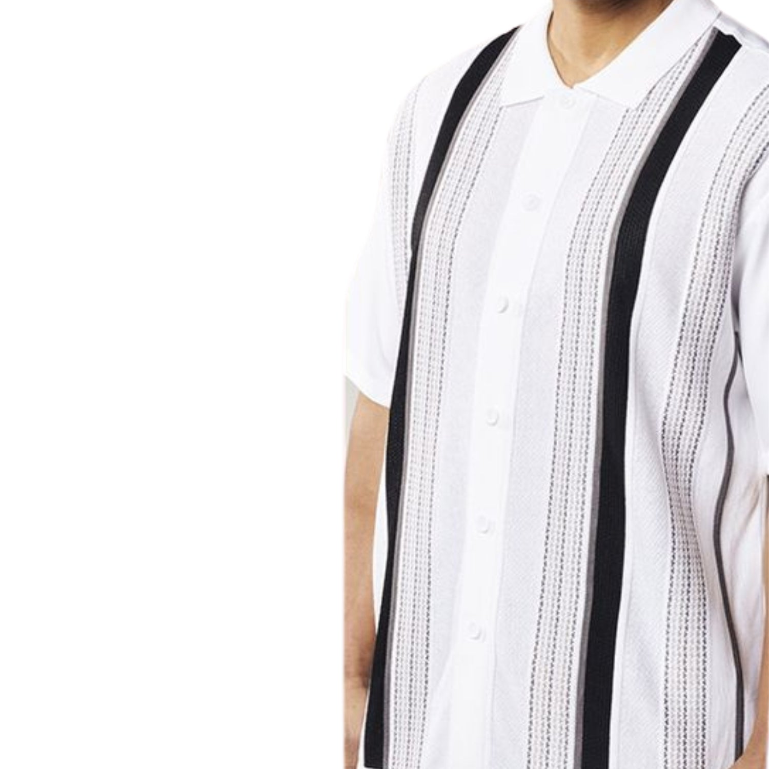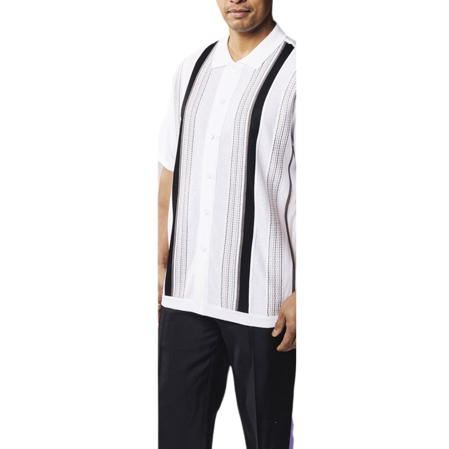 Refined yet modern, this black and white 2-piece walking suit set brings bold contrast to your wardrobe. The short-sleeve button-up shirt features a striking vertical stripe pattern in black against a white textured backdrop, adding dimension and sophistication. Paired with solid black pants, this set is a versatile choice for casual and semi-formal occasions.