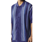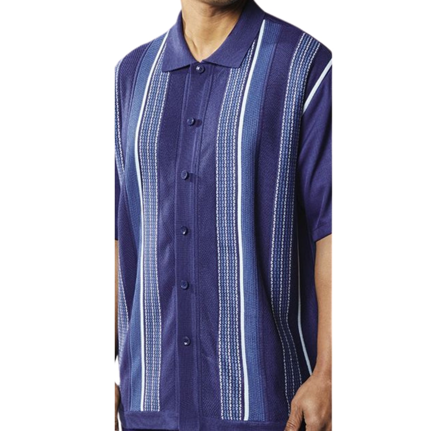 Step up your everyday style with this navy 2-piece walking suit set. Featuring a short-sleeve button-up shirt adorned with vertical textured stripes that add subtle sophistication, paired with solid navy pants for a polished, cohesive look. Ideal for casual gatherings, dinners, or weekend getaways.