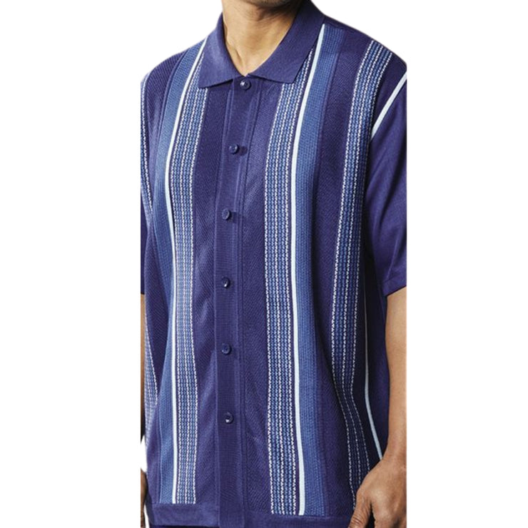 Vardos Collection: Men's Navy 2-Piece Short Sleeve Set with Vertical Textured Stripes
