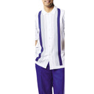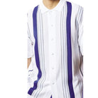 Elevate your everyday style with this striking royal blue and white 2-piece walking suit set. The short-sleeve button-up shirt features bold royal blue vertical stripes on a textured white background, adding a vibrant flair. Paired with solid royal blue pants, this set is perfect for turning heads at casual outings, vacations, or social gatherings.