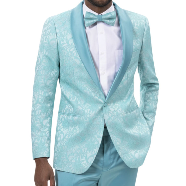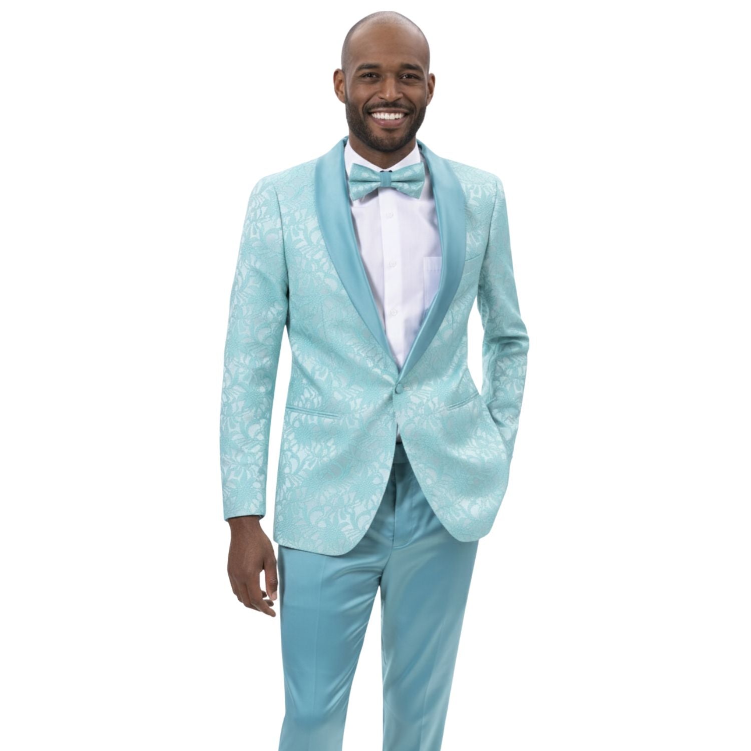 This teal fashion suit is built to turn heads. Featuring a soft floral jacquard pattern with a glossy satin shawl collar, it comes complete with a perfectly coordinated bowtie. Fresh, bold, and ready for any standout moment.