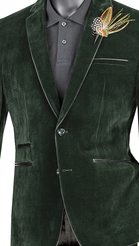 Velourfy Collection: Emerald Velvet with Faux Leather Trim Single Breasted Slim Fit Blazer