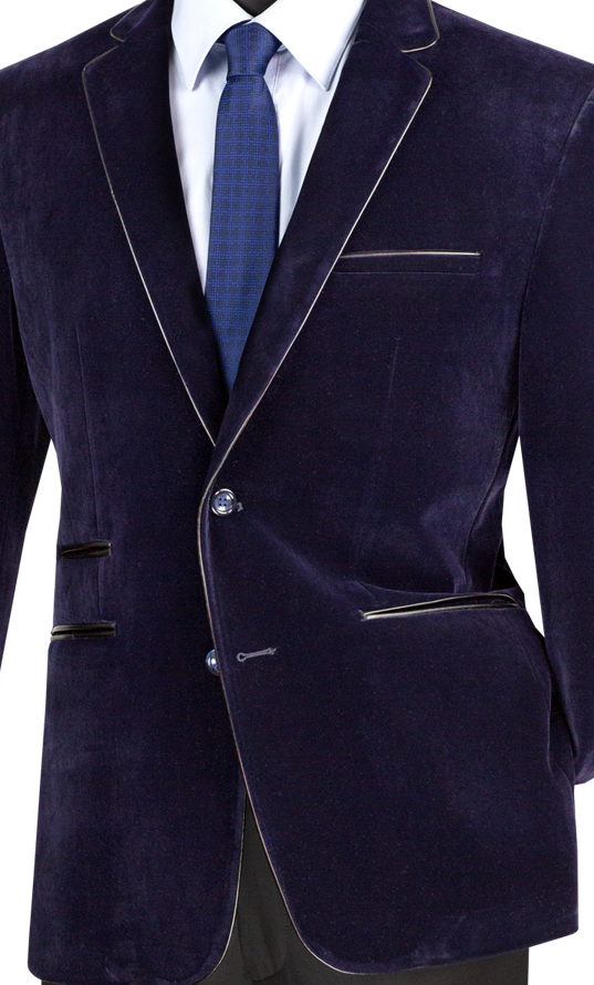 Velourfy Collection: Navy Velvet with Faux Leather Trim Single Breasted Slim Fit Blazer