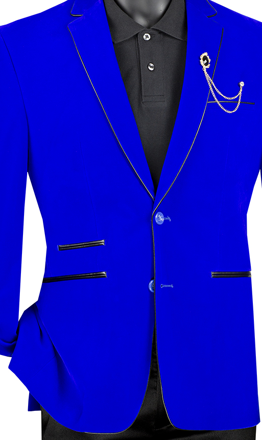 Elevate your wardrobe with the Royal Blue Velvet Sport Coat from our Velourfy Collection. The faux leather trim adds a touch of modern elegance.