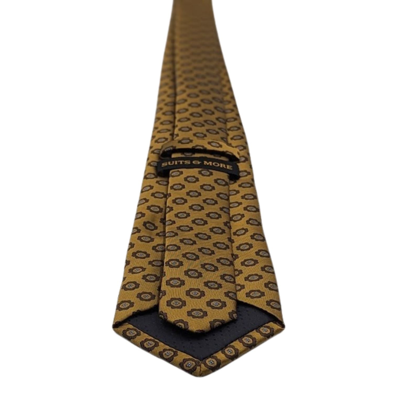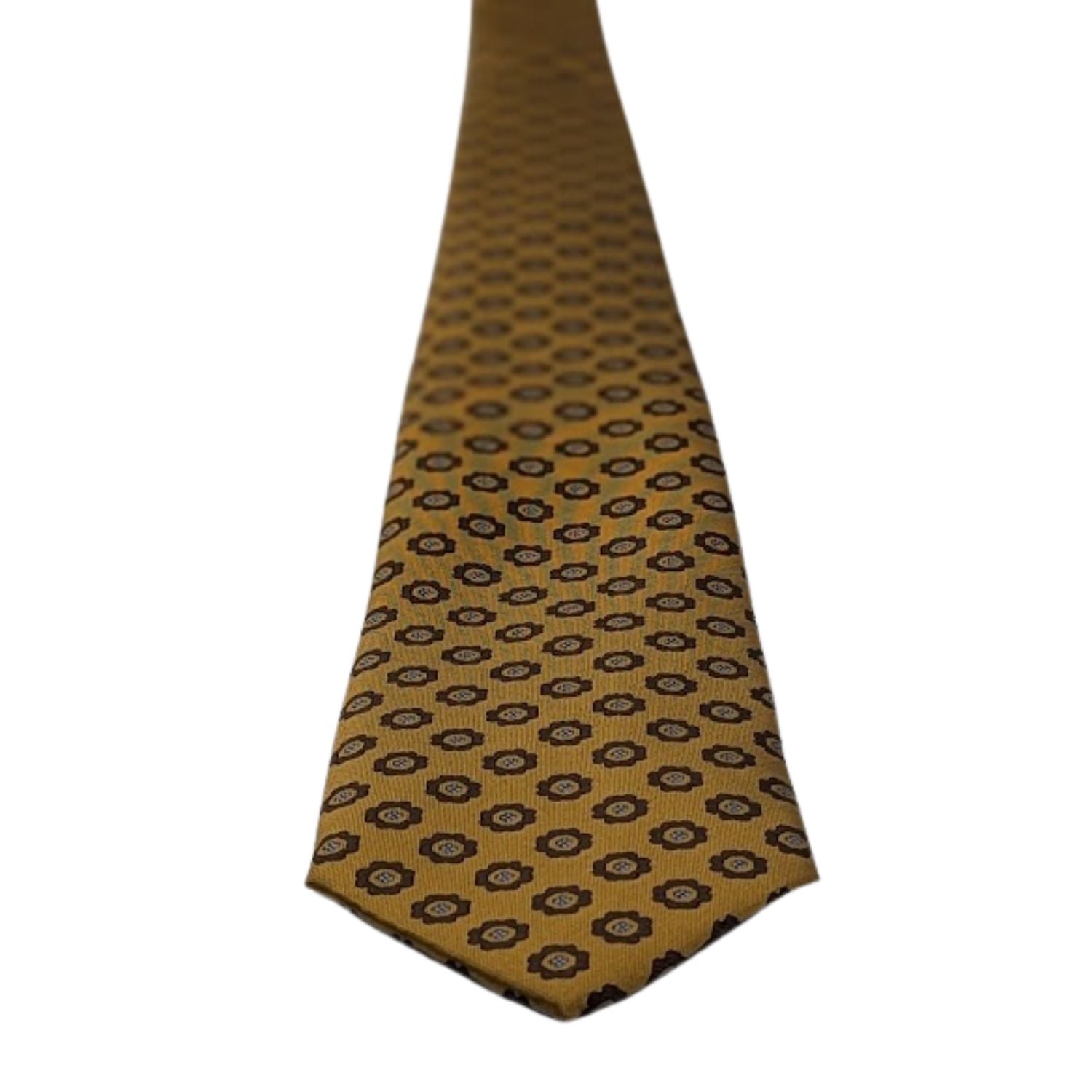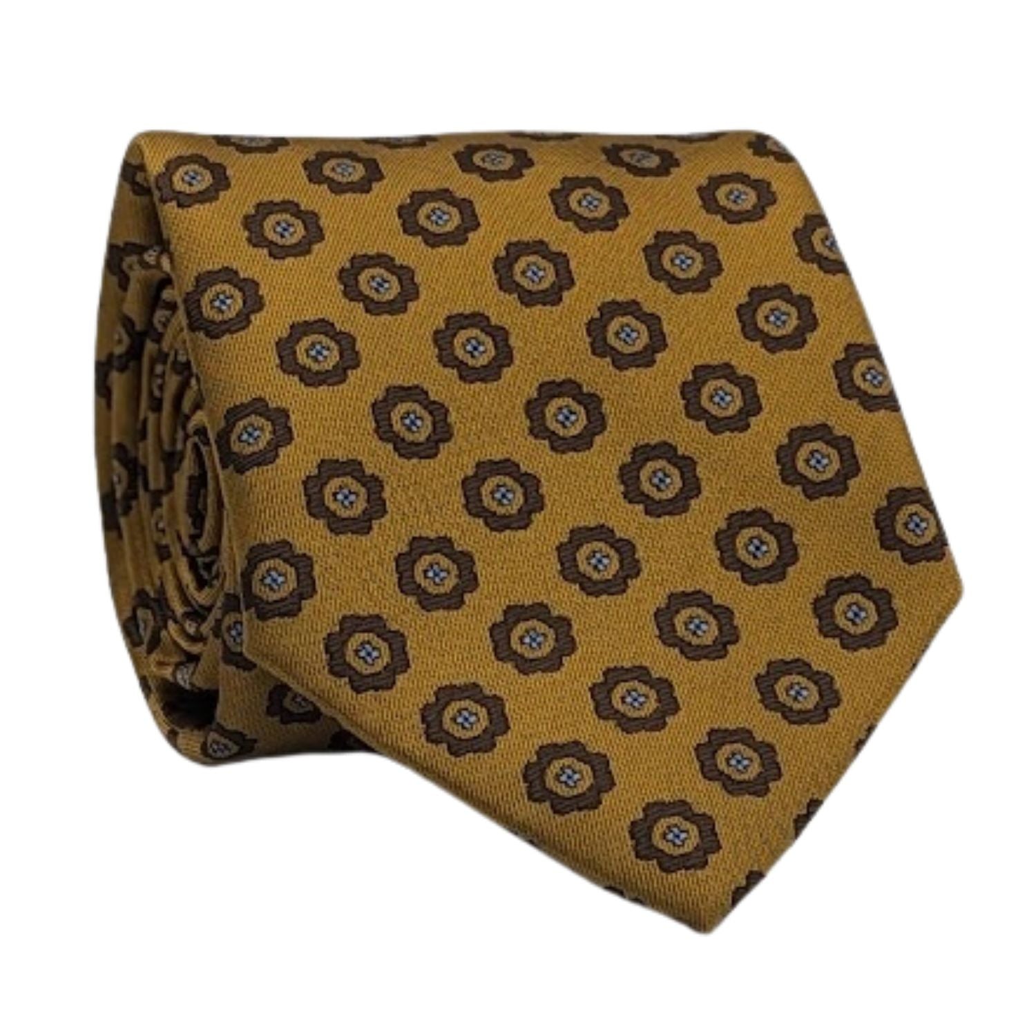 Introducing a golden beacon of style from the Viberant Collection. A tie that's a tapestry of tradition and modernity. This isn't just a tie; it's an emblem of distinction. The geometric floral pattern etched in blue and brown blooms across a field of gold, a design that whispers tales of antiquity with a contemporary cadence.