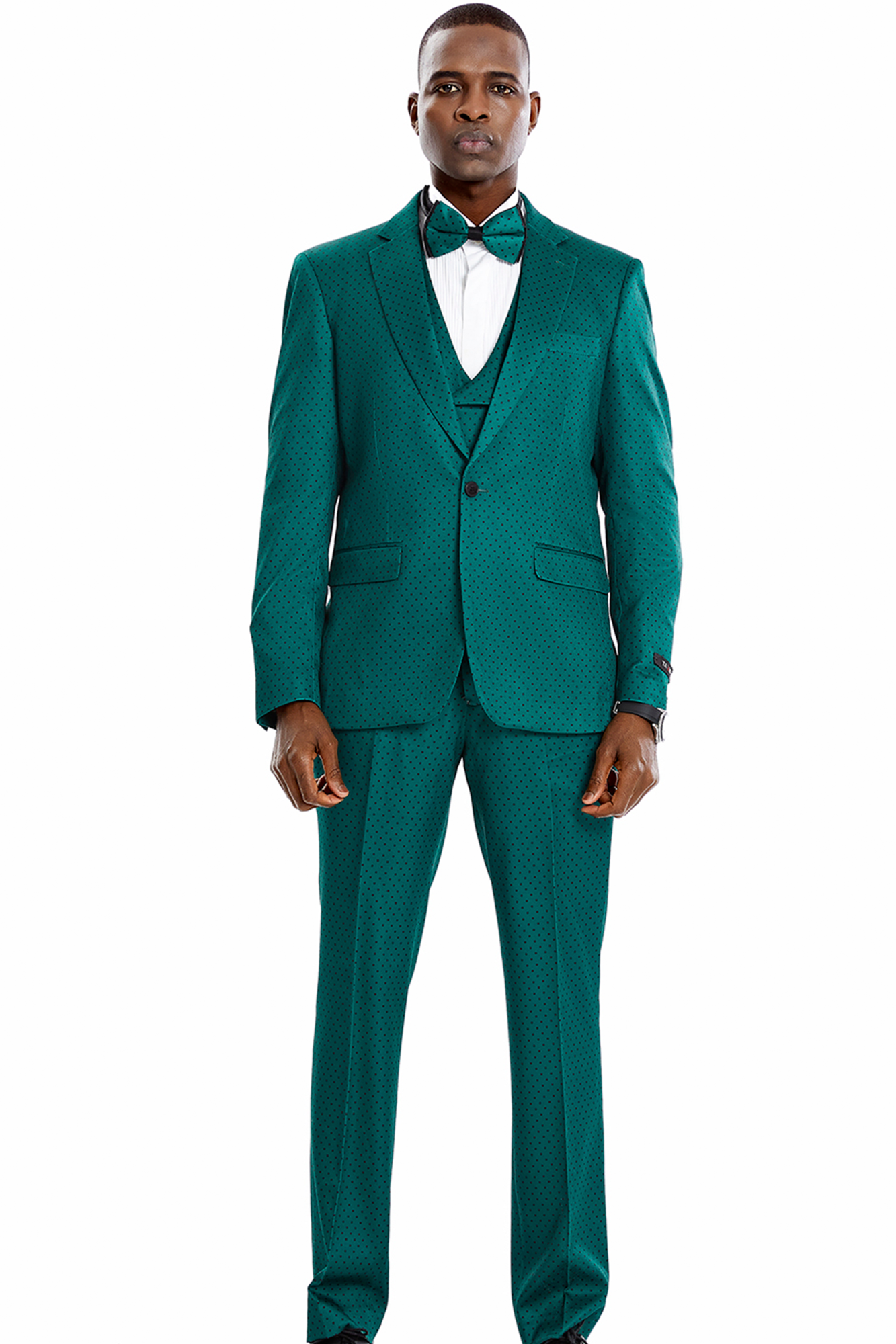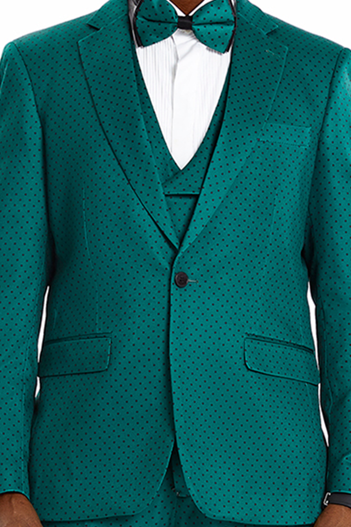 Vibrant Collection: 3-Piece Polka-Dot Slim Fit Suit with Notch Lapel In Emerald/Black