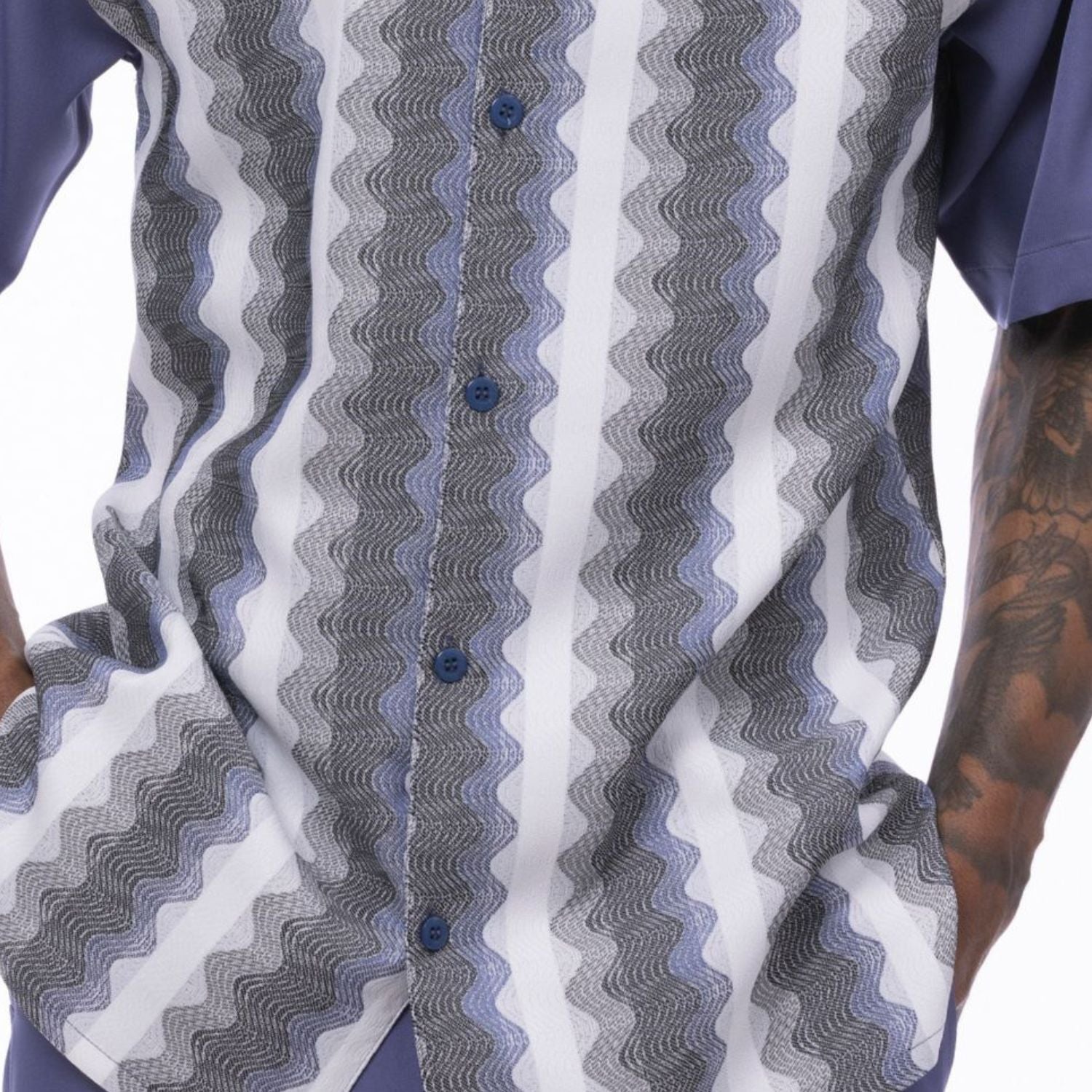 This 2-piece walking suit features a short sleeve button-up shirt with a wave-inspired front pattern, paired with matching solid pants for a clean, balanced look. The pattern combines contrasting tones to create movement without overwhelming the design.