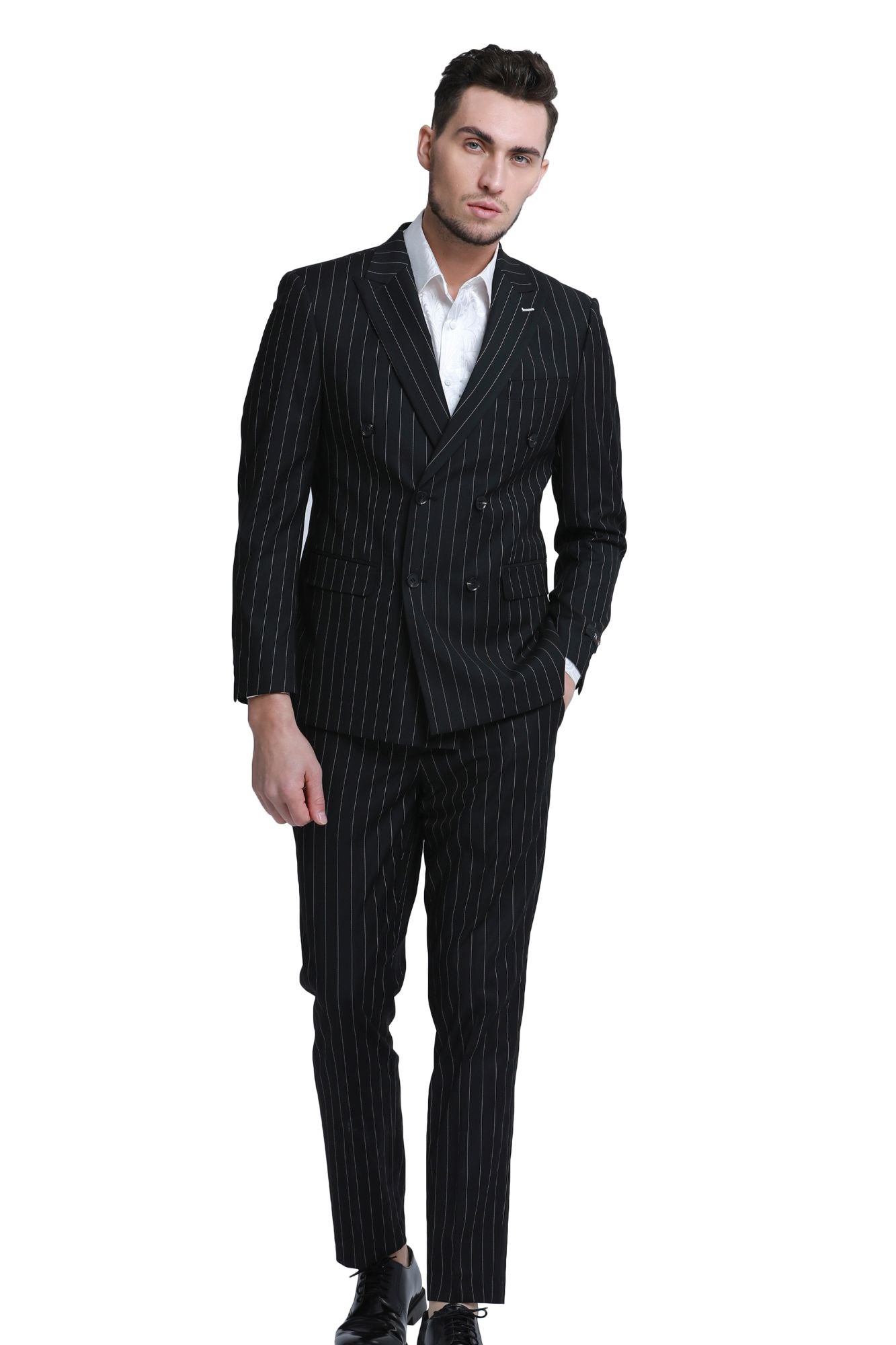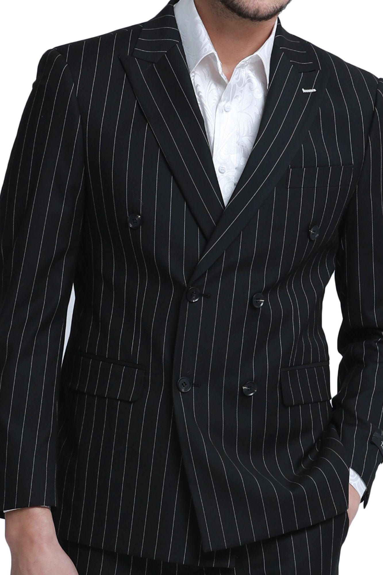 Jacket: The double-breasted jacket, designed with a modern twist on the classic pin stripe, features a two-button closure and peak lapels for a refined look. Side flap pockets and a chest pocket add functionality without compromising style.