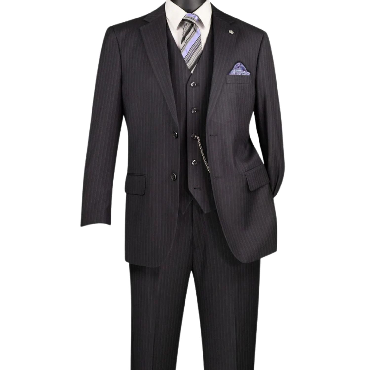 Zeus Zenith Collection: Black 3 Piece Tone-on-Tone Pinstriped Single Breasted Regular Fit Suit